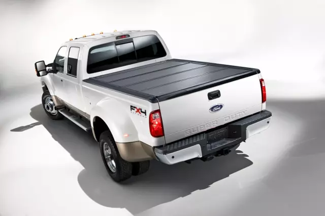 Choose from a range of Tonneau capabilities & appearances - whatever suits you best. All tonneaus extend over the open bed for out-of-sight security. The hard-folding cover allows complete accessibility to the bed rails. Black. Three covers are available: soft roll-up, soft-folding, or hard-folding. Most versions are lockable, fit 6.5 and 8.0 bed lengths, and can be installed/removed in 30 minutes or less. If desired, you can drive with roll-up and folding tonneaus open for bed access. NOTE: This is a Ford Licensed Accessories product see your dealer for limited warranty and other details.